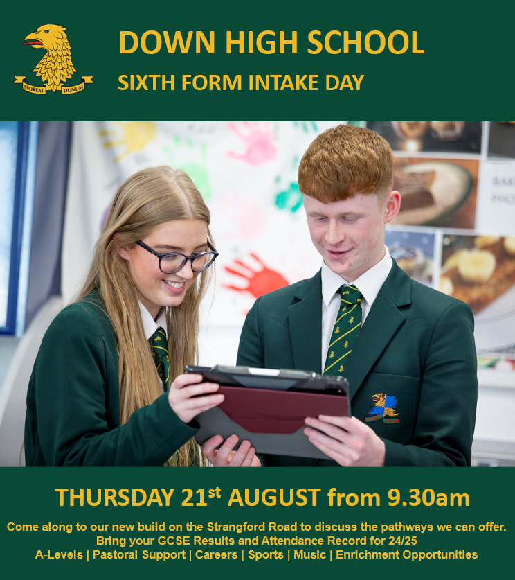 We look forward to welcoming new students into our enlarged 6th Form in September. Down High offers a large menu of post-16 courses, including traditional A-Levels and Applied A-Levels. Please click on the link below to find out more about our 6th Form courses. This year's Sixth Form will be the first to enjoy our brand new, state-of-the-art facilities on the Strangford Road.